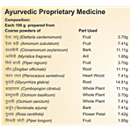Ela Laghu (Elettaria Cardamomum), Ela Badi (Amomum Subulatum), Dalchini (Cinnamomumzeylanicum), Javitri (Myristicafragrans), Mirch Kali (Piper Nigrum), Sonth (Zingiberofficinale), Chandan Lal (Pterocarpussantalinus), Mulethi (Glycyrrhiza Glabra), Agyaghas (Cymbopogoncitratus), Vantulsi (Ocimumbasilicum), Tulsi (Ocimum sanctum), Arjun (Terminalia Arjuna), Gulab (Rosa Centifollia), Pippli Chhoti (Piper longum),