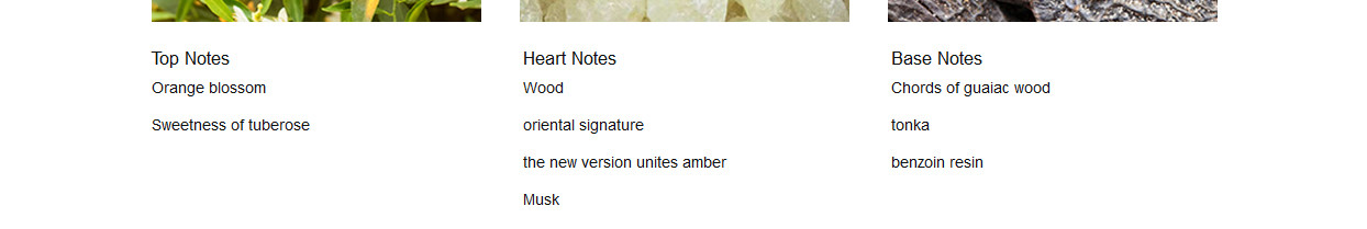 The new versions of the fragrance accentuate luminosity of orange blossom and sweetness of tuberose. Drydown of both fragrances is characterized by warmth of wood and oriental signature, and the new version unites amber, musk and woody notes of sandalwood, unlike the previous, more intense version characteristic by chords of guaiac wood, tonka and benzoin resin.