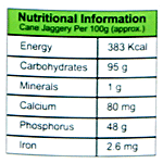 Energy 383 Kcal, Carbohydrate 95 g, Iron 2.6 mg, Calcium 80 mg, Phosphorous 48mg, Minerals 1g