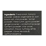 Onion Flakes, Tomato Powder, Refined Oil, Salt, Black Salt, Chili Powder, Fennel Powder, Cumin, Garlic Powder, Ginger Powder, Cardamom Powder, Turmeric Powder, Star Anise, Cinamon, Mace, Nutmeg, White Pepper, Clove, Nevada & Saffron Essence