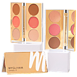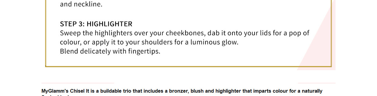 Highlighter - is a gold shade Blush - is a peach shade Bronzer - is a warm brown shade It is also PETA Approved cruelty-free and vegan. MyGlamm's Chisel It is a buildable trio that includes a bronzer, blush and highlighter that imparts colour for a naturally flushed look. In varying levels of intensity, taking you from day to night - from an everyday, wearable blush to a dramatic sculpted look or a more intense evening glow.