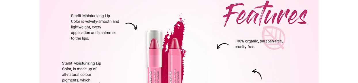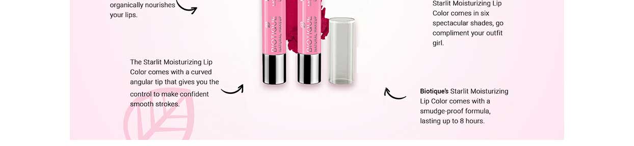 Starlit Moisturising Lip Color is velvety-smooth and lightweight, every application adds shimmer to the lips. Starlit Moisturising Lip Color, is made up of all-natural colour pigments, which organically nourishes your lips. Biotique’s Starlit Moisturising Lip Colour comes with a smudge-proof formula, lasting up to 8 hours. Starlit Moisturising Lip Color comes in six spectacular shades, go compliment your outfit girl. 100% organic, paraben-free, cruelty-free Super nourishing lip colour for comfortably soft and smooth lips which glides smoothly over the lips with an intense colour pay-off. Coats the lips with a veil of colour for soft nourished lips all day long. The Starlit Moisturising Lip Color comes with a curved angular tip that gives you the control to make confident smooth strokes.
