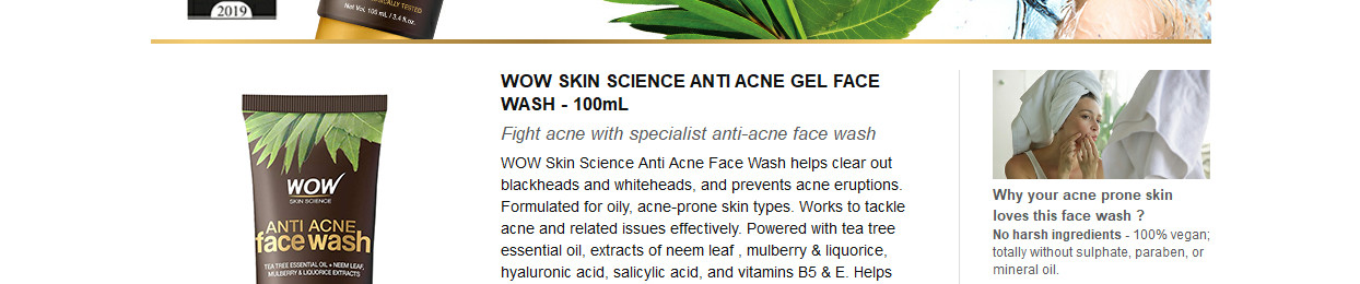 HOME>BEAUTY & HYGIENE>SKIN CARE>FACE CARE>WOW SKIN SCIENCE Anti-Acne Face Wash - Tea Tree Essential Oil+Neem Leaf Extract, Controls Acne, Blackheads, Redness & Itching, No Parabens & Sulphate