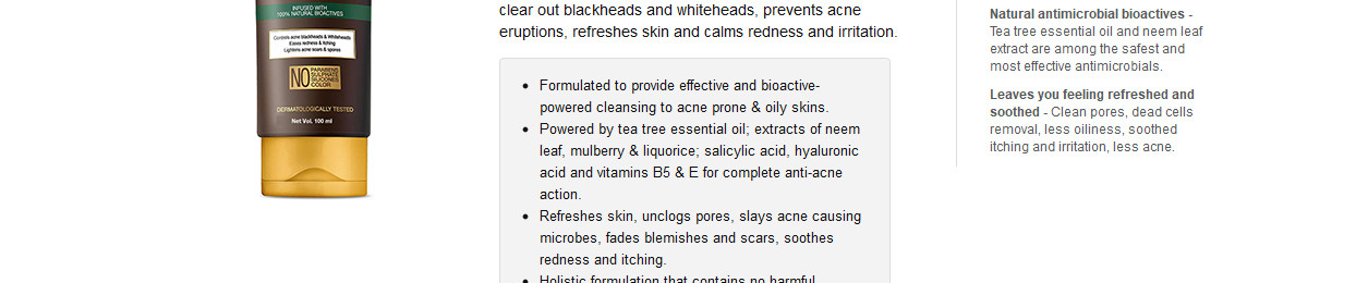 WOW Skin Science Anti Acne Face Wash helps clear out blackheads and whiteheads and prevents acne eruptions. Its gentle bioactive powered gel formulation refreshes your skin and calms redness and irritation. Tea Tree Essential Oil and Neem Leaf Extract are potent natural antimicrobial that help prevent acne-causing bacteria from infecting skin pores. Salicylic Acid dissolves and washes away dead skin cells. Aloe Vera tones, hydrates and softens the skin. Mulberry & liquorice extracts work to lighten scars and blemishes. In a nutshell; this is a face wash formulated to tackle acne and related issues effectively.