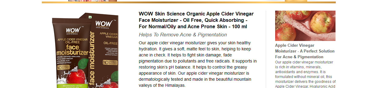Give your skin hydration with WOW Skin Science Apple Cider Vinegar Oil-Free Face Moisturizer. Formulated without mineral oil, this moisturizer delivers the goodness of Apple Cider Vinegar, Hyaluronic Acid and Beetroot Extract. The essential nutrients, minerals and antioxidants aid shield the skin from visible signs of ageing. It helps to fight skin damage due to pollutants and free radicals. It supports restoring the skin’s pH balance and controls the greasy appearance of the skin. This facial moisturizer enhances the skin texture helping in giving it a velvety matte feel. Suitable for oily and sensitive skin.