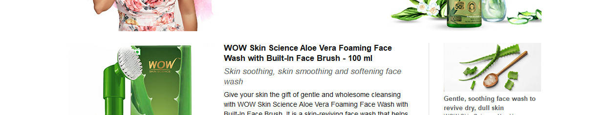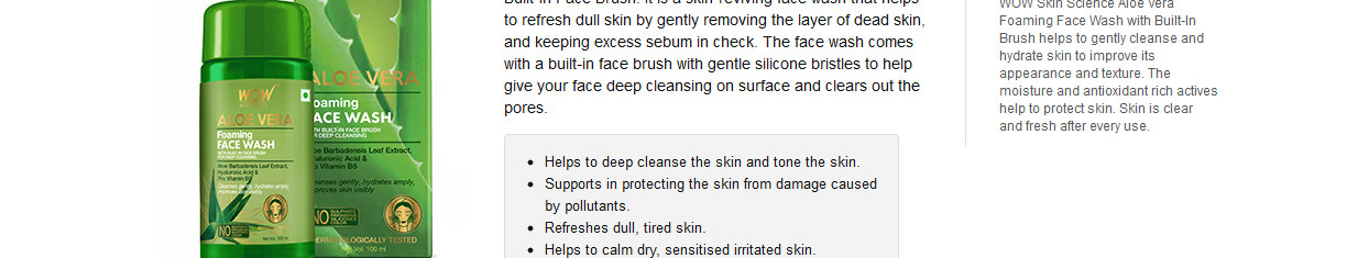 Give your skin the gift of gentle and wholesome cleansing with WOW Skin Science Aloe Vera Foaming Face Wash with Built-In Face Brush. It is a skin-reviving face wash that helps to refresh dull skin by gently removing the layer of dead skin, and keeping excess sebum in check. The face wash comes with a built-in face brush with gentle silicone bristles to help give your face deep cleansing on the surface and clears out the pores. Enriched with Aloe Vera, hyaluronic acid, green tea, calendula flower and cucumber, it helps to cleanse, tone, hydrate and soothe your skin. Aloe vera extract helps to keep the skin hydrated and nourished, while green tea supports in protecting the skin from damage by environmental pollutants. The actives in this soothing and nourishing face wash help to calm irritated skin and retain the moisture mantle of the skin. It refreshes tired skin and helps to boost suppleness and radiance.