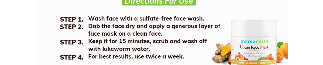 About the product Indulge in the luxurious experience of the Mamaearth Ubtan Face Mask, a unique formula that combines the power of saffron, turmeric, and apricot oil to give your skin a fresh, radiant glow. Saffron is renowned for its ability to clear spots and lighten the skin tone, enhancing your complexion. Apricot oil firms and tones the skin, while its vitamins A and E soothe and slow down the ageing process. Antioxidants in turmeric protect your skin cells from free radical damage and further lighten your skin tone. Dermatologically tested and hypoallergenic, this face mask is free from harmful chemicals like SLES, sulphates, phthalates, and artificial fragrances. Elevate your skincare routine with this powerful and effective face mask, and experience the difference it can make for your skin.