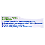 1. Dilute 5ml into 5L of water and stir well. 2. Soak soiled clothes completely for 30 - 45 minutes. 3. Hand wash after soaking. 4. Rinse completely with clean water.