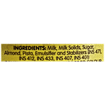 Milk, Milk Solids, Sugar, Almond, Pista, Emulsifier and Stabilizers (INS 471, INS 412, INS 433, INS 407, INS 401). Contains Permitted Synthetic Food Colour (INS 102, INS 122 & INS 133) And Added Artificial Flavour And Flavouring Substances - Kewra.