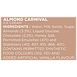 Water, Milk Solids, Sugar, Almonds (3.3%), Liquid Glucose, Chocolate (2.2%), Honey, Salt, Permitted Emulsifier (471) and Stabilizers (412, 407, 410, 466, 401). Contains Permitted Synthetic Food Colours (102, 110) And Added Artificial Vanilla Flavour.