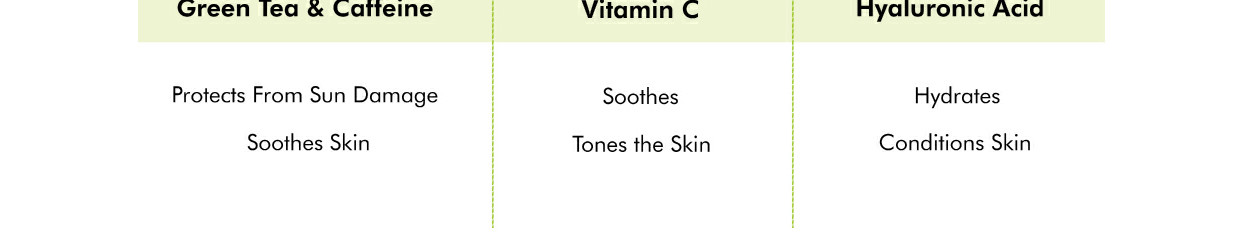 The anti-inflammatory property of green tea soothes the skin and makes it ideal for everyday skincare; reduces dark spots as well. The Caffeine in Green Tea tones & soothes the skin and gives a healthy glow. Vitamin C relieves skin irritants and also protects the skin from sun damage. One vital ingredient for your skin is the Hyaluronic Acid in the serum, which not only hydrates and makes the skin supple but also conditions the skin.