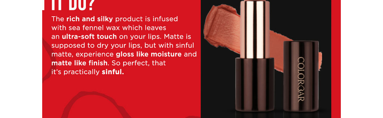 The matte that is so rich, so silky, and so bold - it’s practically sinful. Every stroke gives you a powerful blast of long-lasting colour and a luxurious matte finish. Infused with sea fennel wax, Sinful Matte leaves an ultra-soft touch on your lips. Matte really shouldn’t be this addictive. No parabens. No artificial fragrances. No talc. Only love. Formulated in Italy.