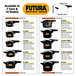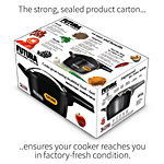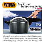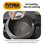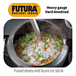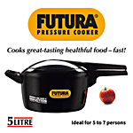 A beautiful combination of form and function, Futura is the only pressure cooker in the world to have been displayed by The Museum of Modern Art, New York. Futura cooks on average 46% faster than a microwave oven. Ideal for 5 or 7 people. Inside fitting safety lid - will not open until the pressure falls. Black body heats faster, does not react with food and stays looking new for years. Thick base - stays flat, heat evenly. Hawkins Pressure Cooking can reduce normal cooking time by as much as half – you save fuel and therefore money. Also, steaming is ideal for low-calorie, low-fat cooking. It evokes the natural flavours of the food-producing delicious results. Pressure cooking retains certain nutritive elements such as proteins and vitamins The beautiful, durable black finish given by 60 microns thick hard anodising has two benefits. It makes the pressure cooker absorb heat faster making it more energy efficient. And the pressure cooker stays looking new for years. The unique pressure regulating system gives you the convenience of finger-tip pressure release and prevents clogging of the steam vent. The double-thick base stays flat, heats evenly and is ideal for light frying before pressure cooking. Suitable for gas, electric, ceramic and halogen cooktops.