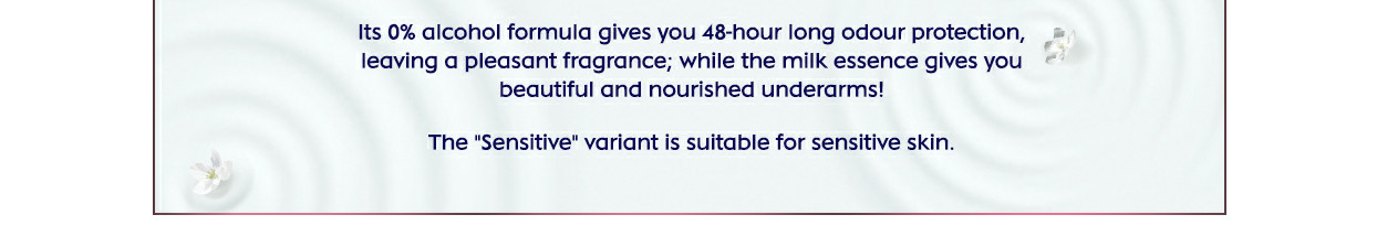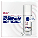 DEO MILK is NIVEA's first range of deodorant sprays and roll-ons with precious milk essence, which gives you fragrant, beautiful and nourished underarms!It replenishes, protects and beautifies underarm skin for instant silky softness after hair removal. The "Sensitive" variant is suitable for sensitive skin.