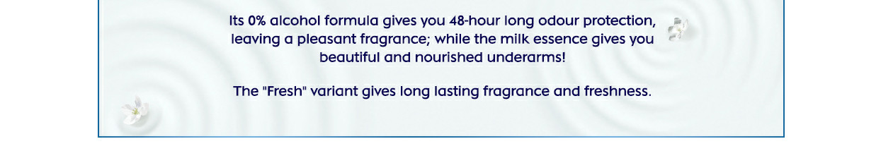 DEO MILK is NIVEA's first range of deodorant sprays and roll-ons with precious milk essence, which gives you fragrant, beautiful and nourished underarms!It replenishes, protects and beautifies underarm skin for instant silky softness after hair removal. The "Fresh" variant gives long-lasting fragrance and freshness.