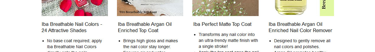 No basecoat application needed. Apply 1 - 2 coats of Iba Breathable Nail Colour directly on to your nails followed by Iba Breathable Argan Oil Enriched Top Coat or Iba Perfect Matte Top Coat as desired for healthy, long-lasting nail colour experience.