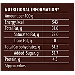 Energy KCal-543, Total Fat g-31.0, Saturated Fat g-23.0, Trans Fat g-0, Total Carbohydrates g-61.5, Added Sugar g-51.7, Protein g-4.5 * approx. value.
