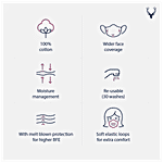 3 layer mask with a melt-blown interior layer with high bacterial filtration efficiency. Anti-microbial finish, very lightweight, foldable, easily breathable, reusable(washable) cloth masks made from 100% cotton, easy to maintain & high on durability – up to 30 washes, woven fabric to protect from fluids and for a soft feel on the skin. Elasticated head loops, nose wire for better adjustment.