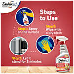 Dabur Sanitize Multipurpose surface cleaner and disinfectant can be used to clean and disinfect practically any household surface and object including Glass and wooden tables, Door Knobs & other metal surfaces, Electrical/ Electronic Appliances exteriors - T.V, Remote, Mobile phones, Kitchen Surfaces & Cabinets, Bathroom surfaces etc. It helps to get rid of the toughest of the stains while providing a healthy environment for your family.