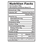Serving Size 100 g Serving per container 10 Calories 347 Total Fat 1.0 g Saturated Fat 0.3 g Trans Fat 0 g Cholesterol 0 mg Sodium 15 mg Total Carbohydrate 57.0 g Dietary Fibre 16.0 g Sugars 6.4 g Protein 23.4 g