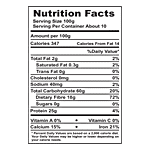 Serving Size 100 g Serving per container 10 Calories 347 Total Fat 2.0 g Saturated Fat 0.3 g Trans Fat 0 g Cholesterol 0 mg Sodium 40 mg Total Carbohydrate 60.0 g Dietary Fibre 18.0 g Sugars 0 g Protein 25.0 g