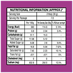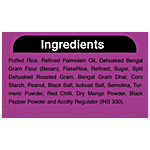 Puffed Rice (37%), Refined Palmolein Oil, Dehusked Bengal Gram Flour (Besan)(19%), Split Bengal Gram (Dal Chana)(8%), Sugar, Roasted Split Bengal Gram (Dal Chana) (3.7%), Peanut (3.7), Flaked Rice (3.3%), Corn Starch, Seasoning Mixed Powder ( Turmeric, Chili, Dried Mango Powder, Pepper Black (Kali Mirch), Acidifying Agent (INS330)), Edible Common Salt, Black Salt & Semolina (Rawa).