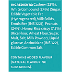 Cashew (25%), White Compound (24%) [Sugar, Edible Vegetable Fat (Hydrogenated), Milk Solids, Emulsifier (INS 322)], Peanuts (24%), Honey, Rice crispy (7.5%) (Rice Flour, Wheat Flour, Sugar, Malt, Salt, Milk Powder), Liquid glucose, Antioxidant (INS 322), Edible common salt