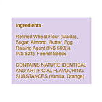 Refined Wheat Flour (Maida), Sugar, Almond, Butter, Egg, Raising Agent (INS 500(ii), INS 521), Fennel Seeds, CONTAINS NATURE IDENTICAL AND ARTIFICIAL FLAVOURING SUBSTANCES (Vanilla, Orange)