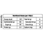 Nutrition per gram/ml: 100g Energy (kcal): 321 Total fat (g): 0 Carbohydrate (g): 80 Saturated fat (g): 0 Sugar (g): 28 Trans fat (g): 0 Protein (g): 0.1 Sodium (mg): 30
