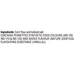 Corn flour and Iodised salt. CONTAINS PERMITTED SYNTHETIC FOOD COLOURS (INS 102, INS 110 & INS 122) AND ADDED FLAVOUR (NATURE IDENTICAL FLAVOURING SUBSTANCE (VANILLA)).