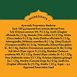 Each 100g prepared from extracts derived from Tulsi (Ocimum sanctum Wh. Pl.) 2.5g, Sunthi (Zingiber officinale Rz.) 2.5g, Manuka (Vitis vinifera Fr.) 2.25g, Nimbu (Citrus medica Fr.) 0.5g, Amla (Emblica Officinalis Fr.) 2.5g, Ashwagandha (Withania somnifera Rt.) 1.0g, Guduchi (Tinospora cordiflia St.) 0.5g, Yestimadhu (Glycyrrhiza glabra St., Rt.) 1.0g, Dalchini (Cinnamonum zeylanicum St. Bk.) 0.25g, Kali Mirch (Piper nigrum Fr.) 0.25g, Kantakari (Solanum surattense Wh. Pl.) 1.25g, Kankol (Piper cubeba Dr Fr.) 1.25g, Vasa (Adhatoda vasica Lf.) 1.25g, Kulanjan (Alpenia galangal Rz.) 1.25g, Haridra (Curcuma longa Rz.) 0.5g, Sunthi (Zingiber officinale Rz. Ext.) 0.75g, Madhu 1.25 g, Sugar – q.s. Approved Preservative Used: Potassium Sorbate