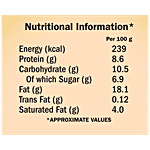 Nutrition per gram/ml: 100g Energy (kcal): 239 Protein (g): 8.6 Carbohydrate (g): 10.5 Of which Sugar (g): 6.9 Fat (g): 18.1 Trans Fat (g): 0.12 Saturated Fat (g): 4.0