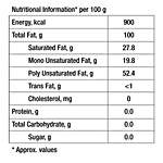 Energy - 900 kcal Total Fat - 100g Saturated Fat - 27.8g Mono Unsaturared Fat - 19.8g Poly Unsaturated Fat - 52.4g Trans Fat - <1g Cholestrol - 0mg Protein- 0g Total carbohydrate - 0g Sugar - 0g.