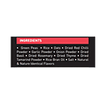 Green Peas, Rice, Oats, Dried Red Chilli Powder, Garlic Powder, Onion Poder, Dried Basil, Dried Rosemary, Dried Thyme, Dried Tamarind Powder, Rice Bran Oil, Salt, Natural &Nature Identical Flavours.