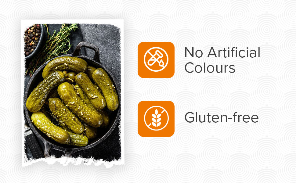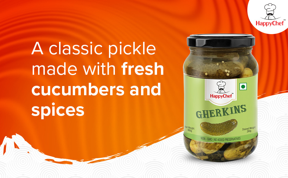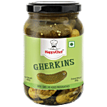About the productEnhance the taste of your sandwiches, salads & burgers with Happy Chef's delicious and juicy Gherkins. Gherkins are a best source of fibre, which is useful to clean the digestive tract. They contain Vitamin A, B, C and minerals like manganese, potassium, magnesium and calcium. All these nutrients help in staying healthy. This mouth-watering, non-GMO topping will keep you wanting for more. The yummy taste of baby gherkins in dill and mustard brine will tickle your taste buds and make your meal wholesome. This easy to carry, comfortable jar of gherkins will ensure you to eat healthy even on picnics and outings.