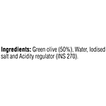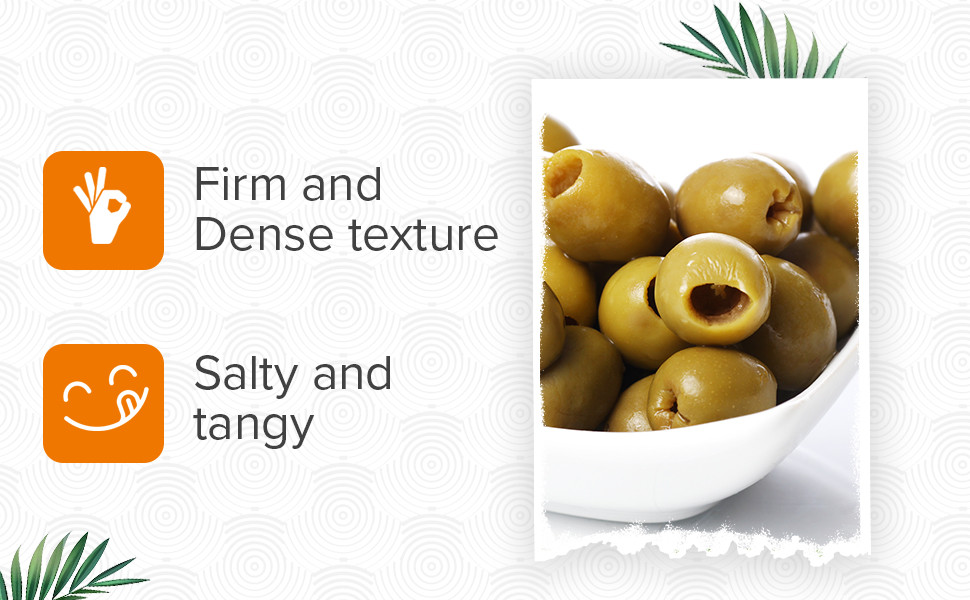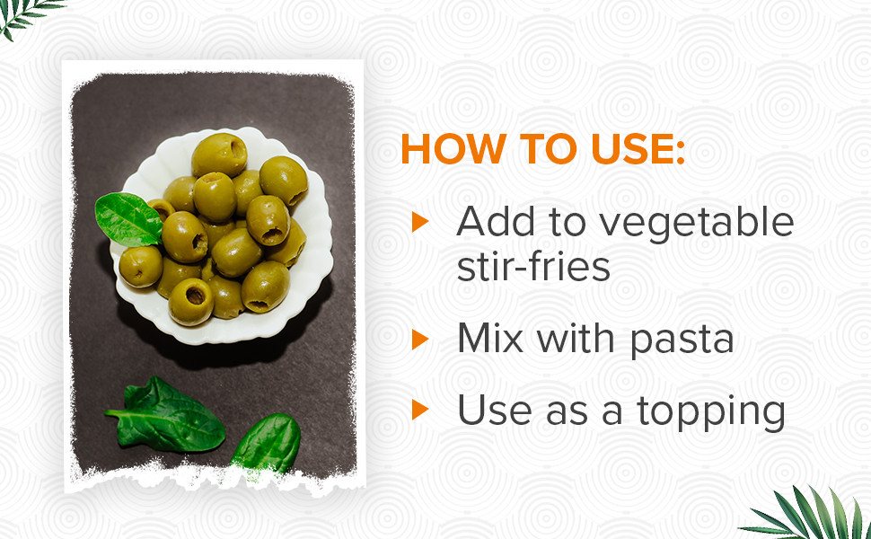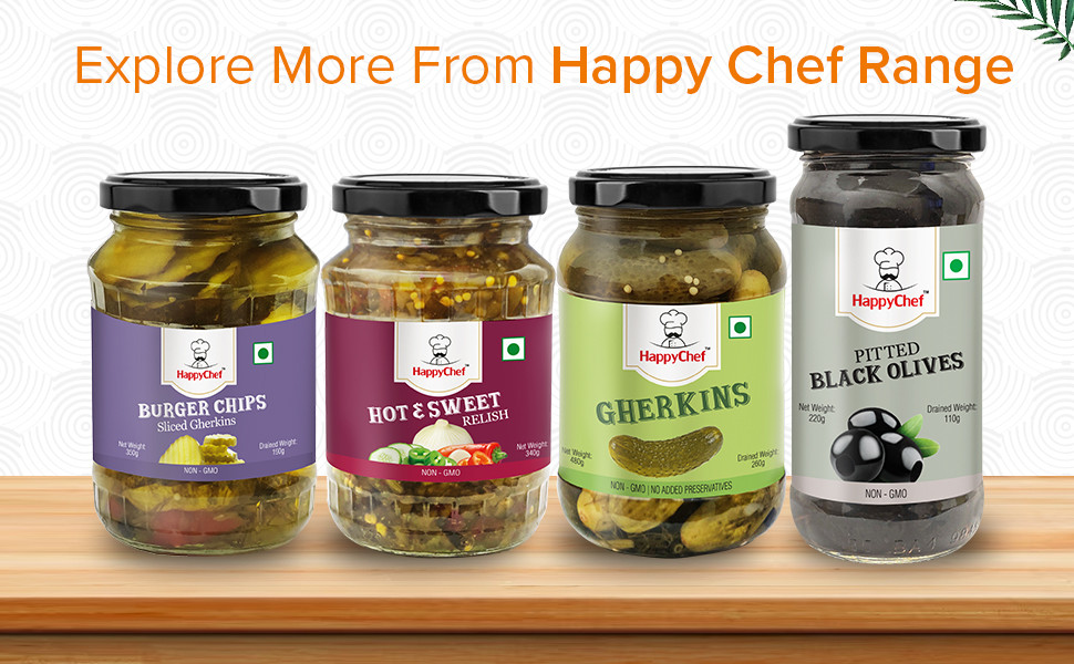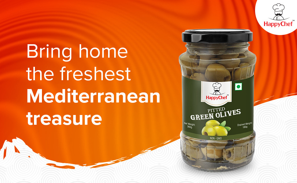 About the productHappyChef Pitted Green Olives are a jar of tangy goodness that makes for the perfect topping on any savoury treat. Pair it on your favourite subs, salads or pizza and enjoy a burst of flavours with the tangy goodness of olives. These olives are prepared from real ingredients and are not genetically modified ensuring you have natural flavours in each bite. Explore HappyChef's range of other toppings too like gherkins, jalapenos and more and level up your dish.