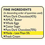 Pure Dark Chocolate (45%) Fresh Cream Pure Dark Chocolate 70% Amul Butter Whole Eggs Castor Sugar Maida - Less Than 5%