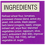 Refined Wheat Flour, Tomatoes, Processed Cheese Blend, Active Dry Yeast, Milk Solid, Black Pepper, Herb Blend (Oregano, Basil), Vinegar, Iodised Salt, Soya Flour, Balanced Vegetables (Onion, Capsicum, Corns, Olive) Antioxidants (Ins300), Improver (Ins170(I), (Ins1100), Refined Vegetable Oil, Sugar.