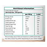 Nutrition per gram/ml: 100g Serving Size: 100 grams Energy (kcal): 402.62 Protein (g): 10.06 Carbohydrate (g): 78.4 Total Sugars (g): 0 Added Sugars (g): 0 Total Fat (g): 5.4 Saturated Fat (g): <0.45 Trans Fat (g): <0.00 Cholestrol (mg): 0 Sodium (mg): 0.31