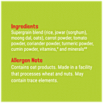 Moong Dal, Oats, Rice, JowarNutrition per gram/ml: 100g Serving Size: 30g Energy: 410 kcal Protein: 15 g Carbohydrate: 81 g Total Sugar: 2 g Added Sugar: 0 g Dietary Fibre: 9 g Salt: 0 g Sodium: 0 mg Total Fat: 2.5 g Saturated Fat: 0 g Trans Fat: 0 g Cholesterol: 0 g Vitamin A: 400 mcg Vitamin C: 40 mg Vitamin D: 5 mcg Vitamin E: 2.5 mg Vitamin B1 (Thiamine): 0.5 mg Vitamin B2 (Riboflavin): 0.6 mg Nicotinamide: 8 mg Vitamin B6 (Pyridoxin): 0.9 mg Vitamin B12: 0.6 mcg Folic Acid: 80 mcg Calcium: 600 mg Iron: 9 mg Zinc: 5 mg