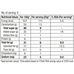 Nutrition per gram/ml: 100g Serving Size: 20g Energy (kcal): 557 Carbohydrate (g): 59 Total sugar (g): 46 Added sugar (g): 35 Dietary fibre (g): 7 Protein (g): 6 Total fat (g): 31 Saturated fat (g): 17 Trans fat (g): 0.1 Cholesterol (mg): 6 Sodium (mg): 23