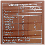 Nutrition per gram/ml: 100g Serving Size: 33.33g Energy (kcal): 513 Protein (g): 9 Total Carbohydrates (g): 57 Total Sugar (g): 35 Added Sugar (g): 34 Total Fat (g): 28 Saturated Fat (g): 16 Trans Fat (g): <0.1 Cholesterol (mg): <1.0 Sodium (mg): 28