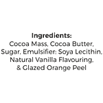 Cocoa Mass, Cocoa Butter, Sugar, Emulsifier: Soya Lecithin, Natural Vanilla Flavouring, & Glazed Orange Peel