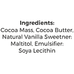 Cocoa Mass, Cocoa Butter, Natural Vanilla Sweeetner: Maltitol, Emulsifier: Soya Lecithin