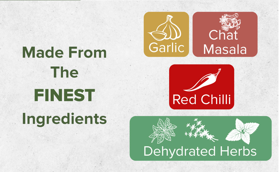 Dehydrated Garlic (40%), Mixed Spices (Red Chilli, Chat Masala), Dehydrated Herbs, Iodised Salt, Natural Spice Extract (Garlic), Edible Vegetable Oil (Soybean).