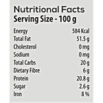 Serving Size 100g (energy 584 Kcal, Total Fat 51.5g, Cholesterol 0 Mg, Sodium 0mg, Total Carbs 20 G, Dietary Fibre 6g, Protein 20.8g, Sugar2.6g, Iron 8%)