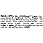 Green Chilli Pieces, Water, Lime paste, Spices & Condiments [Mustard Dal, Fenugreek Powder, Mustard Powder, Fenugreek Seed, Fennel Whole, Turmeric Powder, Coriander Powder, Cumin Powder, Fennel Powder, Bishop’s Seed (Ajwain), Asafoetida], Iodised Salt, Mustard Oil, Acidity Regulator (INS 260), Black Salt and Preservative (INS 211).