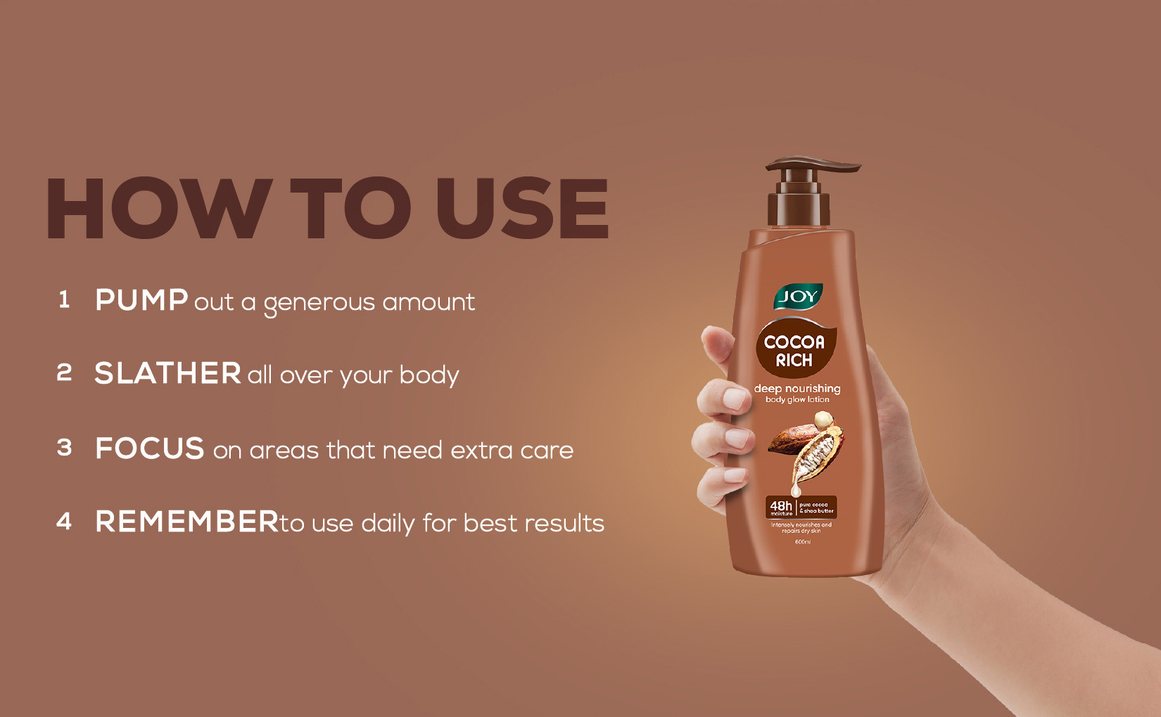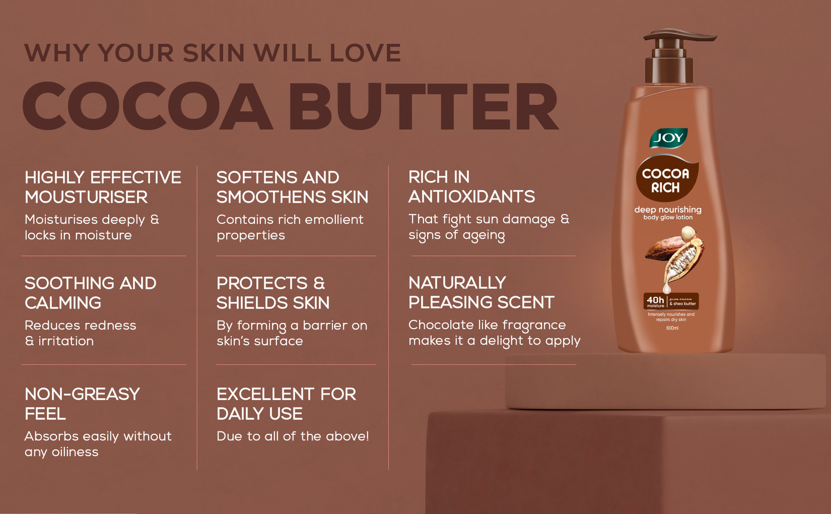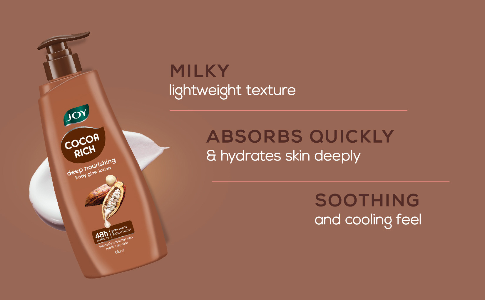 Joy Intense Nourishing Body Lotion with Cocoa & Shea Butter ensures 24-hour skin softness. Formulated with pure cocoa butter to offer extra-rich nourishment to the skin with a long-lasting effect. Cocoa Butter helps nourish the deepest layers, keeping skin firm and healthy. Luxuriously creamy Shea Butter leaves skin soft and glowing with health. Skin feels smoother, younger and radiant.