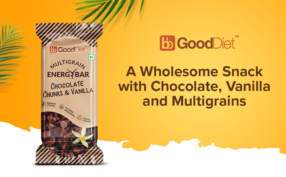 About the productGoodDiet is here with so much more than just taste and health. We are here with Multi-Grain Energy Bar - Chocolate Chunk Vanilla. Now, that's what we call a tasty and wholesome bar. To match the day-to-day hustled routine and keep the energy up, we bring you this bar to the job. It's loaded with rich ingredients like rolled oats, honey, brown rice flakes, dark chocolate, peanuts, rice crisps, watermelon seeds, sunflower seeds, pearl millet flakes, chia seeds, ragi flakes and dates. This super nutritious and tasty bar is rich in protein, carbs, and fibre. Its prebiotic quality helps the growth of beneficial bacteria in the stomach to aid digestion and gut health. From athletes, fitness freaks, students, moms to anyone who has a rigorous day, this bar helps keep that energy high and body healthy.