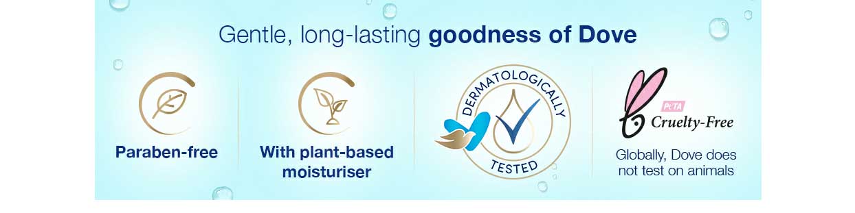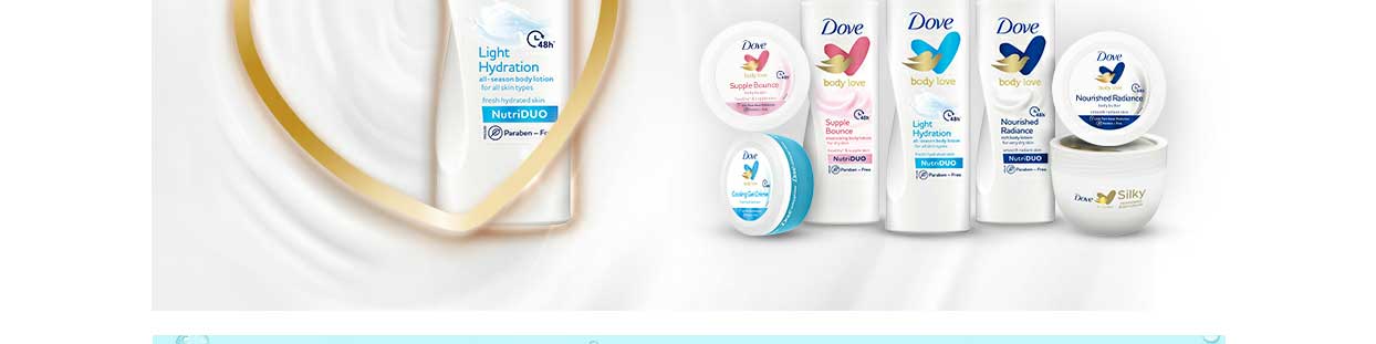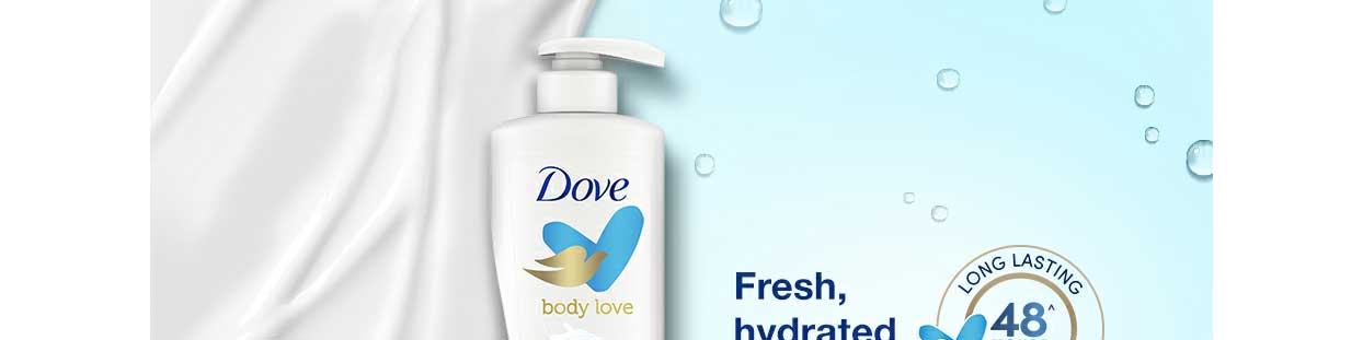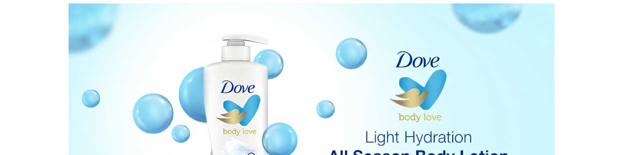 Enjoy the feeling of soft and hydrated skin with New Dove Light Hydration Body Lotion. It is formulated with a plant-based Moisturiser. This new Dove Light Hydration is a fast-absorbing lotion. Goodness, that lasts.